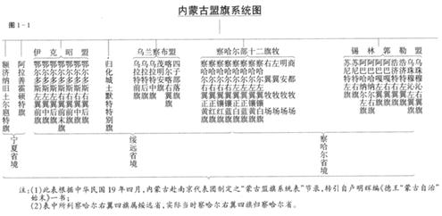 (4)綏境蒙政會(huì)。民國(guó)19年(1930年),德穆楚克棟魯普等向國(guó)民政府提出“蒙古自治”的要求。內(nèi)蒙赴南京代表團(tuán)制定之《蒙古盟旗系統(tǒng)表》見(jiàn)圖1-1。