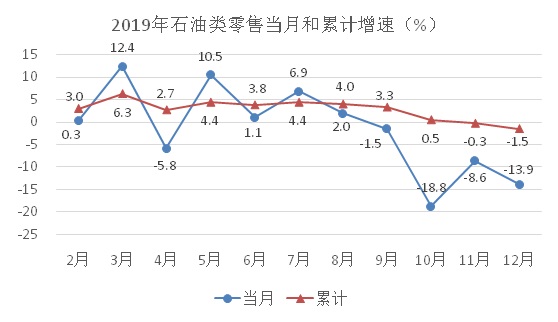 受油價(jià)波動(dòng)、市場(chǎng)競(jìng)爭(zhēng)等影響,加之2019年底降雪增多,對(duì)石油零售市場(chǎng)運(yùn)行產(chǎn)生較大影響,限額以上石油類(lèi)商品零售增速放緩。2019年,全區(qū)限上石油制品類(lèi)商品零售額下降1.5%,較前三季度回落4.8個(gè)百分點(diǎn),下拉全年限上單位零售額增速0.5個(gè)百分點(diǎn)。
