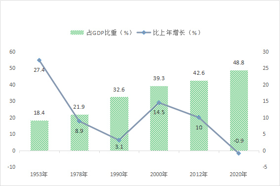 圖1 1953—2020年服務(wù)業(yè)增加值占GDP比重及增速
