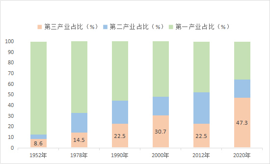 圖2 1952—2020年三次產(chǎn)業(yè)就業(yè)人員比重構(gòu)成