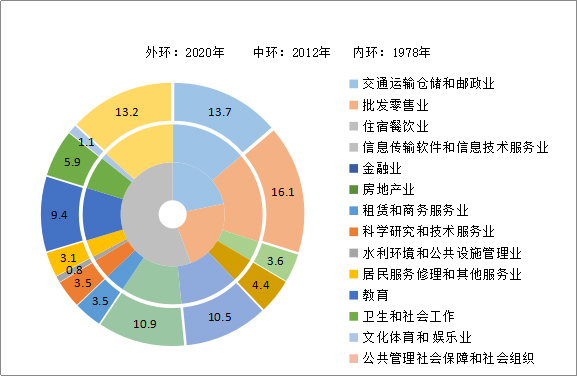 圖3 1978—2020年第三產(chǎn)業(yè)增加值構(gòu)成(%)