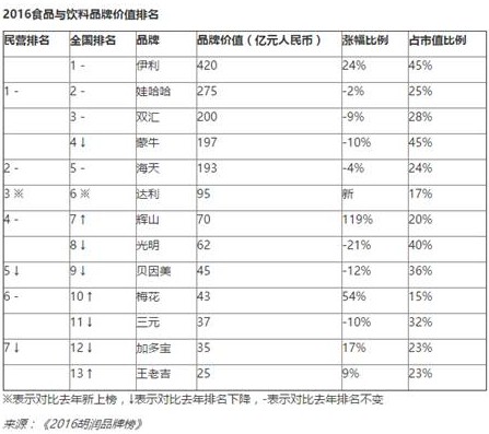 近日,胡潤研究院發(fā)布了《2016胡潤品牌榜》,共200個最具價值中國品牌上榜。伊利在食品飲料行業(yè)所有上榜品牌中以420億元(人民幣)的品牌價值排名第一,品牌價值上升24%。就在幾個月前,在2016年度BrandZ™中國最具價值品牌100強榜單中,伊利集團以62.35億美元的品牌價值,蟬聯食品類排行榜第一,品牌價值和去年同期相比提升了22%。