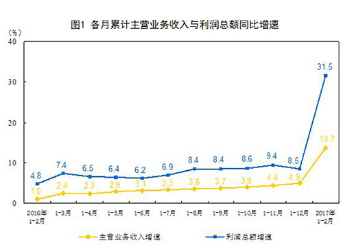 1-2月份,全國(guó)規(guī)模以上工業(yè)企業(yè)實(shí)現(xiàn)利潤(rùn)總額10156.8億元,同比增長(zhǎng)31.5%。