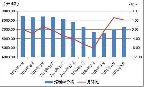 5月,全區(qū)煤制PP市場行情仍較為堅挺,口罩等防護用品對纖維材料需求依舊較大,PP下游剛需強勁,企業(yè)補庫意愿較強。同時,5月停產(chǎn)檢修企業(yè)較多,PP市場供給有所減少,加上兩油塑料去庫存速度增快,國際原油價格上漲,推動全區(qū)煤制PP價格小幅上漲。5月,全區(qū)煤制PP平均價格為7270.50元/噸,環(huán)比上漲4.05%。