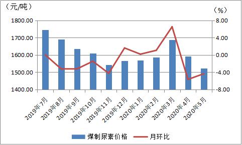5月,國內(nèi)尿素市場供應(yīng)充足,而夏季農(nóng)需未至需求依然偏弱,全區(qū)煤制尿素價格繼續(xù)下探創(chuàng)新低。5月,全區(qū)煤制尿素平均價格為1523.28元/噸,環(huán)比下降4.36%。