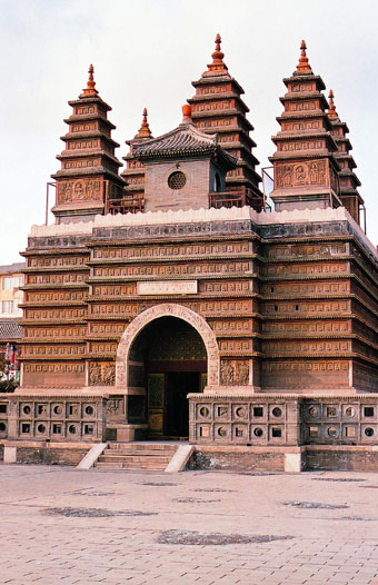 塔身南側(cè)正中,開一拱形券門,門旁為磚雕四大天王像,門上正中嵌蒙、藏、漢3種文字的“金剛座舍利寶塔”石刻匾額。自券門進(jìn)入塔內(nèi),正中為經(jīng)堂,東西各有一小室。東側(cè)小室設(shè)有攀登到金剛座上的階梯,階梯出口處為一座四角攢尖頂?shù)男⊥ぁW敳?/SPAN>5座方形舍利寶塔,象征著金剛五界。黨中央一塔最高,塔身7層,四隅之塔略低,塔身5層。各小塔第一層嵌佛像、菩薩及菩提樹等磚雕,第二層以上設(shè)佛龕;5座小塔塔頂分別覆黃綠琉璃寶珠。