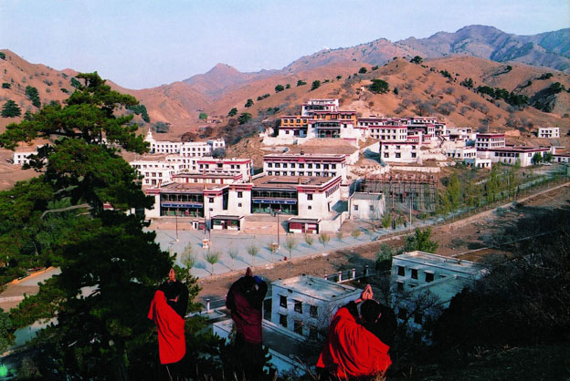 五當(dāng)召始建于清康熙年間,以西藏扎什倫布寺為藍本,經(jīng)乾隆、嘉慶、光緒年間多次維修、擴建,遂成今日規(guī)模。寺廟被群山環(huán)抱,山上蒼松翠柳,郁郁蔥蔥,寺前小溪清澈,流水涓涓。整個寺院依山勢建造,規(guī)模宏大,殿堂倉舍2 538間,占地約20萬平方米,鼎盛時喇嘛1 200多人。所有建筑均采用藏式結(jié)構(gòu):平頂、直墻、小窗、白色,整個寺院與山巔松柏輝映,顯得十分精美壯觀。五當(dāng)召內(nèi)有金、銀、銅、木、泥各種質(zhì)料制成的佛像1 500余尊,其中最大的有三層樓高,最小的不過盈寸。寺內(nèi)現(xiàn)存的大量壁畫,精細逼真地描繪了歷史人物、風(fēng)俗、神話及山水花鳥,是研究少數(shù)民族歷史文化的寶貴資料。現(xiàn)在,五當(dāng)召依然是本召喇嘛進行佛事活動和信徒們朝拜的場所。這里每年舉行“嘛呢會”等佛事活動。寺廟兩側(cè)各聳立一座白塔,四周白土樓星羅棋布,各殿頂有風(fēng)磨銅雙羚羊?qū)εP法輪和廟徽,陽光下金光璀璨,樹立在茂密的松柏之間,顯得格外莊嚴(yán)壯觀。