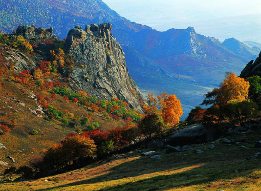 登上峰頂,頓覺天低地闊,四野茫茫,山風入懷,心曠神怡。此時你的心理會有一個強烈的感覺:這是大青山主峰,也就是說,此刻是站在大青山的最高處俯瞰千山萬壑,腳下是你伸手可觸的白云,此刻你的胸懷同天地一樣大!從主峰看去,東西一線分為南北截然不同的兩種景色:北望群山,皆光禿渾圓,一片蒼黃,如濁浪滔滔;而向南看,則群山如屏,嵐煙蒸騰,草木蒼翠,猶如面對一個絕勝之畫境。目光再遠些,則是蒼茫的土默川,哈素海如浮在綠海中的一顆珍珠,而黃河如練。