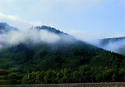 神山,作為扎賚特旗的象征以她高大峻偉聞名遐邇。站在遠(yuǎn)處遙望神山,云嶺蒼茫,如巨龍騰空。近看怪石嶙峋,峰險谷深。巍巍神山,嵯峨險峻,令人咂舌。陰雨天云纏霧繞,難辨其真面目。晴朗天亦輕煙漫漫,如細(xì)紗裹體,給人以神奇迷離之感。神山,可能是因人們的神奇?zhèn)髡f加上這種神秘而得名的吧。