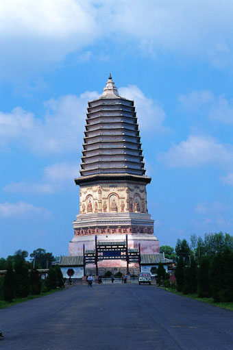 大明塔為八角形十三層密檐式實(shí)心磚塔,總高