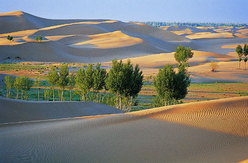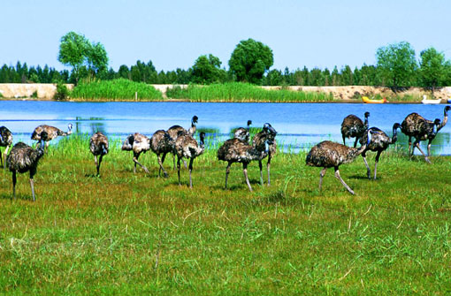 •  從包頭出發(fā),過黃河古渡口和昭君墳,沿專線公路南行70公里,便到了沙漠中的海市蜃樓—恩格貝公園。恩格貝創(chuàng)造了一個藝術(shù)地對立統(tǒng)一模式:黃色的沙漠中,一片綠樹舒枝展葉;干涸的沙丘間,一汪湖水碧如明鏡;人跡少見之地,如今鴕鳥起舞,孔雀朝陽。它位于鄂爾多斯市庫布其大漠腹地,距達拉特旗文化古跡昭君墳約15公里。恩格貝為蒙古語,漢譯為“平安、吉祥”之意。恩格貝開發(fā)利用于1989年。開發(fā)總面積達30萬畝,整個開發(fā)區(qū)種樹種草3萬畝,其中,果樹、花圃、名貴藥材等1 200多畝。植被覆蓋率達85%以上。區(qū)內(nèi)飼養(yǎng)動物10余種1萬頭(只),其中,有珍貴的中華絨山羊3 000余只,鴨、鵝6 000余只,駝鳥100余只,孔雀100余只。有大型水庫3座,各種人工小湖10余處,蓄水量達400余萬立方米,還開發(fā)出了礦泉水,有月亮湖、飛來湖、天外石等資源、景觀。