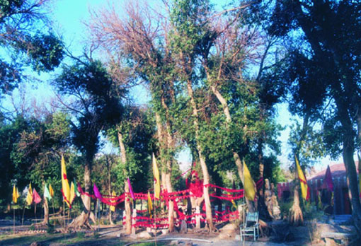 品味著這個耐人尋味的故事,游人們自南向北順?biāo)缕鞯牡谝徽颈愕搅撕鷹顛u。胡楊島由黃河中近鄰的5個島組成,最大的18萬平方米,共計40萬平方米。其中有的島上多蛇蟲,人稱蛇島;有的島上草稀樹少,人稱燒烤島;有的島上黃花茂盛,人稱黃花島。有的島上葦長柳旺,人稱葦柳島;而最著名的就是長著千余株古老胡楊的大島了。胡楊的雄奇特色已有許多記述,此處不再細(xì)說。使人驚奇的是,此島往東往南胡楊均已絕跡。此島的胡楊從何而來?一說是成吉思汗西征的大軍帶來,一說是強(qiáng)勁的沙漠風(fēng)吹來。關(guān)于胡楊島,還流傳著許多神奇的傳說。其中一說就是,曾有兩棵參天胡楊倒入河中,擋住狂風(fēng)暴雨中面臨危難的戰(zhàn)船,救了成吉思汗和他的軍士。胡楊樹倒伏之處崖陡壁峭,斷根猶存,島上人立碑紀(jì)念,取名“救駕崖”。還有一說,講的是一個漢族姑娘和一位少數(shù)民族小伙子的一段純真凄美的愛情故事,他們被封建勢力扼殺后,化作兩棵相依相纏的胡楊樹——這就是胡楊島上最初的公樹和母樹。