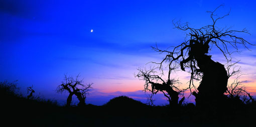 有人感嘆:做人難、做羊難、做樹更難!額濟納作為世界三大原始胡楊林區(qū)之一,已干涸到令人驚心動魄的地步。怪樹林仿佛是上蒼對我們的一番警示。方圓十幾畝,胡楊陳尸遍地,仿佛掙扎著要從流沙的漩渦中脫身,每一種姿勢都令人怦然心碎。獵獵的大漠風(fēng)沙卷過,彈奏出最凄厲的音符,每一聲都仿佛是對人類破壞生態(tài)環(huán)境的聲討。