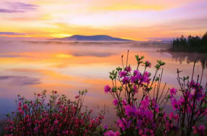 興安杜鵑林沿“林海石瀑”圍成一周。姹紫嫣紅的興安杜鵑在沉睡九萬(wàn)多年的玄武巖上怒放,故又稱其為“杜鵑花山谷”。