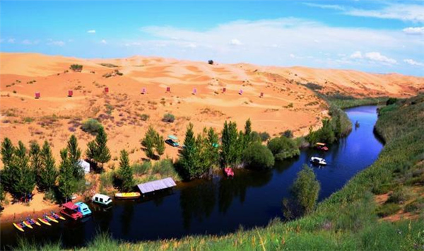 飛來(lái)湖:1989年一場(chǎng)洪水一夜之間沖開,地下泉水與洪水匯集而成,依沙傍水而建的各種游樂(lè)場(chǎng)所,臨窗遠(yuǎn)望,碧波漣漣,游船穿梭,柳林飛翠,蘆葦蕩漾。身后沙漠綿綿,黃沙與藍(lán)天相互映襯。