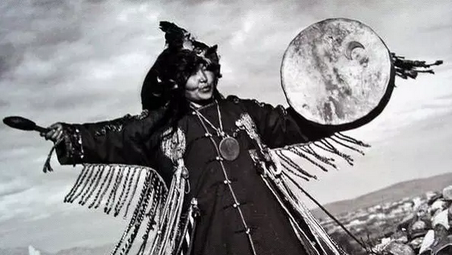 在薩滿長袍上還要套披肩,披肩上嵌有360個小貝殼,披肩的胸口處有1枚護(hù)心鏡,兩肩處有2個布制的鳥形(一雄一雌),稱為“博勒·綽庫爾”。