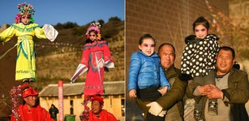2017年2月10日,山西太原臺駘山,來自晉中農(nóng)村的民間非遺藝人在表演社火前后對比