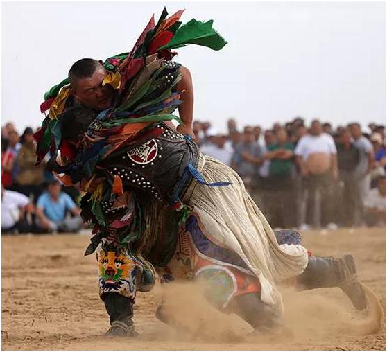 摔跤手們還有一個重要的裝飾是套在脖子上的綴有各色彩條的彩圈。蒙古語稱“景嘎”。它記錄著摔跤手在比賽中獲得過的名次,是著名摔跤手的標志性裝飾。