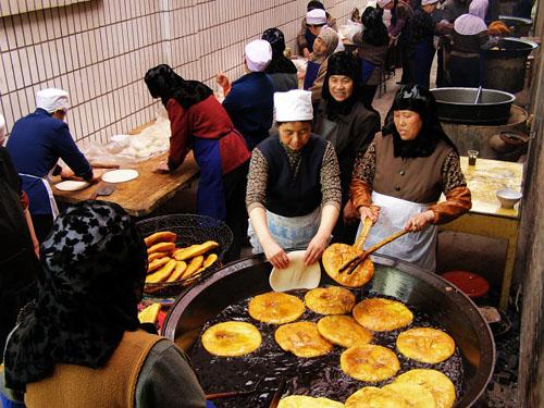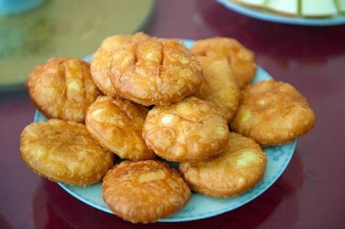 油香是回族的標(biāo)志性傳統(tǒng)食品,代表著回族人民的食俗特色。凡是回族家庭,都有做油香的習(xí)俗。回族在油香的制作和食用上有著共同的特點(diǎn)。常用的制作方法是:先在面粉中加入經(jīng)過發(fā)酵的“面起子”,加入底油,用溫開水拌和,發(fā)酵后適當(dāng)兌堿,再摻進(jìn)適量的干面粉、雞蛋(咸的加少許鹽、香豆粉,甜的加紅糖或白糖),反復(fù)揉壓均勻,攫成面團(tuán),搟成大小一樣厚薄均勻的圓餅狀,用刀在表面切二三行數(shù)個(gè)刀口,或上面再壓花紋,放入滾沸的油鍋內(nèi)炸,待油香膨起,色澤泛紅即可撈出,一個(gè)個(gè)分別晾開。油香酥脆,味美醇香。內(nèi)蒙古東部區(qū)有大油香、小油香;有白面油香、米面油香之分。赤峰等地的油香金黃燦燦,中心膨起氣泡,松軟綿甜,趁熱吃口感更好,另有一番風(fēng)味。回族的油香一般在過節(jié)喜慶或舉意“乜貼”時(shí)炸用,“不請(qǐng)阿訇不動(dòng)油鍋”,表明回族是不能把油香作為一般主食隨意食用的,平時(shí)食用只做油餅,做法與油香略有區(qū)別。另有一種燙面油香,多用于發(fā)送亡人后念“回頭經(jīng)”等場(chǎng)合用,作法簡(jiǎn)單,用滾燙的水和好面后,在滾油中炸熟,撒上白糖,即炸即食。