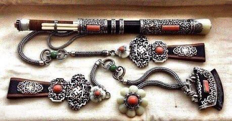 蒙古族不僅穿著鮮艷的蒙古袍,腰系寬厚的腰帶,頭戴棲鷹帽,腳蹬牛皮靴子,表現(xiàn)出了極具個性的民族特點,除此以外,蒙古族男女在裝飾上也很有特點。蒙古族男子傳統(tǒng)裝飾品有褡褳、鼻煙壺、煙袋、煙荷包、火鐮、蒙古刀、手鐲、戒指、圖海等。這些飾物融藝術(shù)性、使用性、裝飾性、保質(zhì)價性、攜帶性于一體。褡褳是裝鼻煙壺和哈達的長方形小袋子,懸掛在男子腰帶左前側(cè)。鼻煙壺是蒙古族男子吸鼻煙及相互請安問候的禮儀工具。火鐮是火柴未進入草原前蒙古族主要的取火工具。蒙古刀、銀碗、戒指等,也是蒙古族男子喜歡的飾物。蒙古族婦女的裝飾主要用金、銀、珍珠、珊瑚、瑪瑙、翡翠、琥珀、綠松石、青金石等名貴材料制作,品種有額箍、墜子、孛勒、發(fā)套、荷包、希勒波其、腦后垂飾、手鐲、戒指、項鏈等。額箍是蒙古婦女頭飾中最尊貴的飾品,一般由套圈、額穗子、瓔珞、腦后穗等組成,在重大喜慶節(jié)日才要戴。墜子是蒙古族已婚婦女日常佩戴的輕便頭飾,孛勒是掛在長坎肩面?zhèn)纫赶碌你y質(zhì)裝飾,希勒波其是戴在腦后和背后鑲嵌大量珊瑚的銀質(zhì)裝飾。蒙古族婦女還喜好戴各色貴重金石制作的手鐲、戒指、項鏈等。