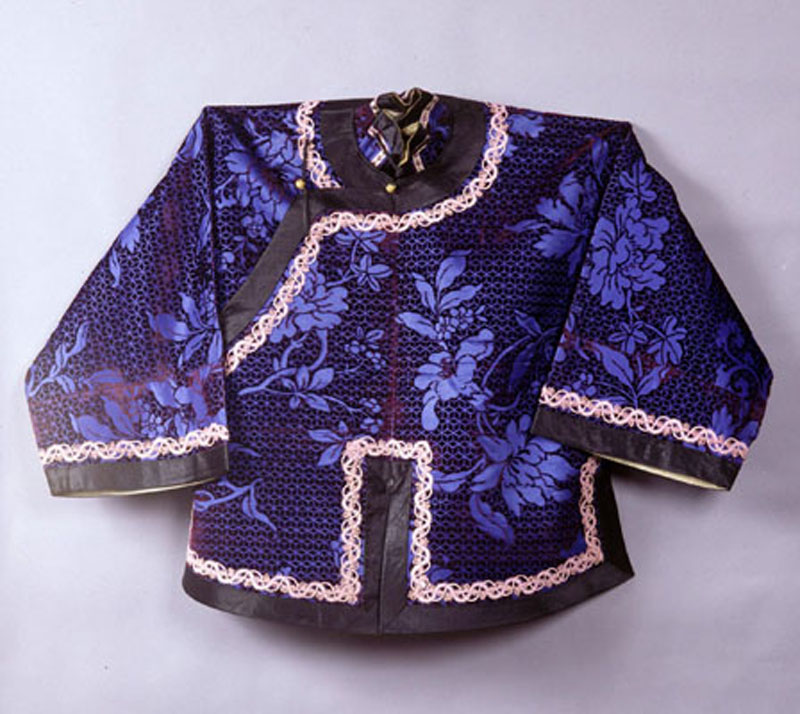 馬褂是八旗將士騎馬時常穿用的一種外褂。其基本形式為圓領(lǐng)、對襟、開衩,身長至臍,袖長及肘,并有扣絆,常和旗袍匹配穿用。