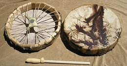 達(dá)斡爾族歷史上信仰薩滿教,薩滿神鼓是薩滿“與神靈交流”的重要法器之一。多用二寸余寬的薄木條烘烤制成圓形框,以鹿、猂、狼等獸皮蒙為單面鼓。并配有一長(zhǎng)條抓手,鼓框上掛有一些響鈴或銅錢(qián),隨著鼓的振動(dòng)和左右擺動(dòng)發(fā)出“嘩啦嘩啦”的響聲,增加了神鼓的音樂(lè)性。鼓槌多為木制蒙以獸皮,柄端綴各色飄帶,飄帶上也綴有鐵鈴和銅錢(qián)等響物。當(dāng)鼓槌敲擊神鼓時(shí),神鼓發(fā)出深而廣的“咚、咚”聲,鼓框及鼓槌上的各種響物同時(shí)發(fā)出有節(jié)奏的清脆伴響,形成極其和諧、悅耳的音律。