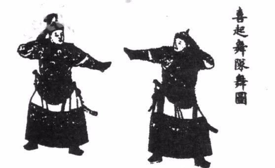 據(jù)《清史稿·樂志》記載:“喜起舞,大臣二十二人,朝服儀刀,入,三叩,興,退東位西向立。以兩而進,舞畢三叩,退。次隊繼進如前儀。”又據(jù)《嘯亭續(xù)錄》記載:“凡大燕享,選侍衛(wèi)之狷捷者十人,咸一品朝服,舞于庭除,歌者豹皮褂貂帽,用國語奏歌,皆敷陳國家憂勤開創(chuàng)之事。樂工吹簫擊鼓以和,舞者應(yīng)節(jié)和拍,頗有古人起舞之意,謂之喜起舞。”喜起舞雖由以前的自娛性舞蹈變?yōu)楸硌菪缘膽c典舞蹈,但仍保持著民間舞蹈的勃勃生氣。