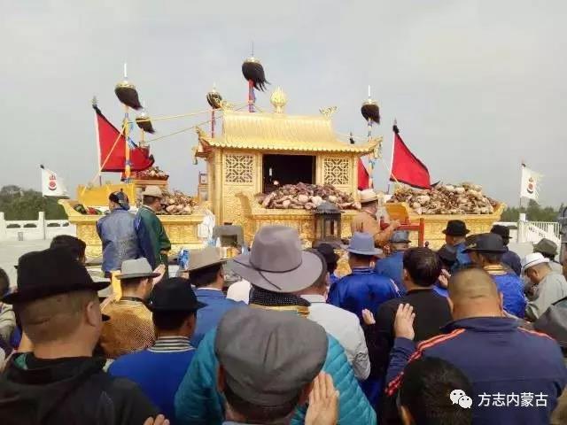 祭祀時將蘇勒德從祭臺上取下來,4位達爾扈特青年把蘇勒德的尖朝向對面放羊頭的地方。一人面朝著蘇勒德,把木盤內的血塊塞進羊的口腔中,并將羊的上下頜張開合上,作咀嚼狀,把羊血嚼碎。此動作重復若干次。4個人拿著蘇勒德單腿跳,將蘇勒德從一個方凳上挪到另一個方凳上,放到方凳上的時候,把蘇勒德在方凳上跺3下,旁邊有一個人念祝詞,有一個人敲鑼,在跺的時候,4人喊著“哈哈”,拿鑼的人敲鑼。
