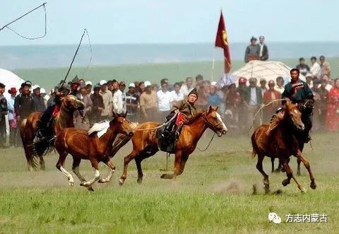 之后,牧馬人把馬群趕回,這時青年牧人施展自己的騎技,套取二歲馬。馬被套中后,一個牧人趕過去,揪住馬耳朵,將馬絆倒,或是揪住馬尾巴,縱馬前奔,一拽尾巴,用一股巧勁使其倒地,然后牧人們趕上去把馬按住,給馬剪鬃、割尾梢、除壞牙。這時馬的主人把自家的畜印燒紅,烙在馬的后腿上部。如果是獻給薩滿的馬,主人要用一個木碗盛滿牛奶,將牛奶從馬的兩耳中間直澆到尾根。富裕的人家還要舉行賽馬、摔跤等活動,以牛、羊獎勵優(yōu)勝者。