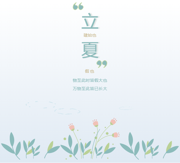 “立夏”的“夏”是“大”的意思,是指春天播種的植物已經(jīng)直立長(zhǎng)大。古代,人們非常重視立夏的禮俗。