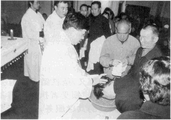傅油圣事又稱終傅。當(dāng)教徒年邁或病危,由司鐸用圣油敷擦老人或病患者的額和手,并誦念一段祈禱經(jīng)文,表示借此可賦恩寵于受敷者,減輕他們神形痛苦,同時(shí)赦免其罪過。
