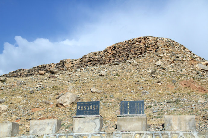 雞鹿塞遺址位于巴彥淖爾市磴口縣沙金套海蘇木巴音烏拉嘎查以北哈日格乃山口西的臺(tái)地上。此城全用片麻巖和卵石砌成,筑于距溝底高約19米的山坡平臺(tái)上。城呈正方形,邊長(zhǎng)約68.5米。墻上端殘存厚度約3.7米,下端厚約5.3米~5.5米,殘墻高一般約7米,最高8米,西北缺口處只有兩米高,平均高度為7.2米。古城只在南墻開(kāi)一城門,城門外有類似甕形的長(zhǎng)方形小圍墻,留有入口。靠南墻東部?jī)?nèi)側(cè)和西北角砌有磴道。城內(nèi)出土文物有:漢代繩紋磚瓦、灰陶片、箭簇和一件青銅弩機(jī)。