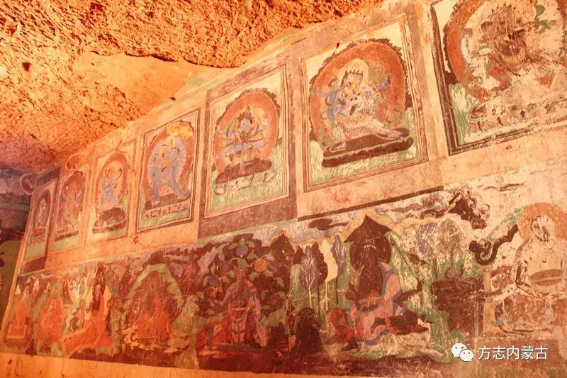 壁畫多使用綠、黑、白、紅諸色。壁畫內(nèi)容有佛像、天王像、菩薩像、宗喀巴座像、觀音像,以及佛教本生、變相故事、供養(yǎng)人像等。在題材方面,有表現(xiàn)真善美、假丑惡的畫面。如靜穆慈祥的菩薩以及為非作歹的異教徒、妖魔鬼怪的獰惡丑陋。在佛教、密教和傳統(tǒng)神話故事中,畫有五馬分尸、烏鴉啄尸、火燒尸、油鍋炸尸等宗教刑罰圖。還有騎馬駕云、三頭六臂、人獸相搏等畫面,造型十分逼真。在民族宗教方面,畫有手拿法器的救度佛母,紅、綠、藍等色表現(xiàn)的歡喜佛合抱的畫面,以及威武英俊的天王像。這些佛像的后面,還有裝飾性的背光圈和云彩景色,莊嚴而富麗。