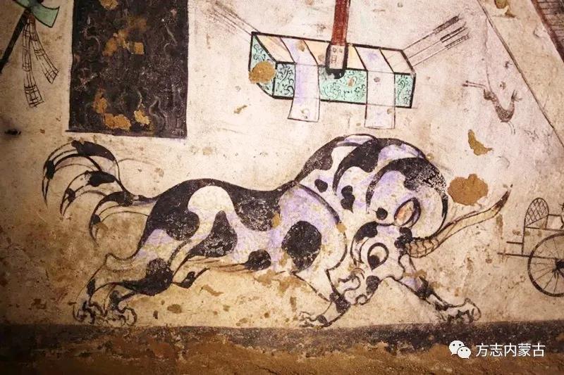 墓室右壁:繪有角樓、圍墻,角樓外以斗拱支撐的臺(tái)榭。臺(tái)榭上三男子張弓射禽;三女子身著束腰長(zhǎng)裙曳地袍,帽側(cè)飾翎。三女子身后繪有頭戴方冠,冠上插飾兩組分叉枝條的一坐者。臺(tái)榭右部繪出高山放牧圖,山中繪馬、牛及樹(shù)木、天空,樹(shù)上均有鳥(niǎo)雀。山頭上坐兩個(gè)牧人,手執(zhí)鞭。
