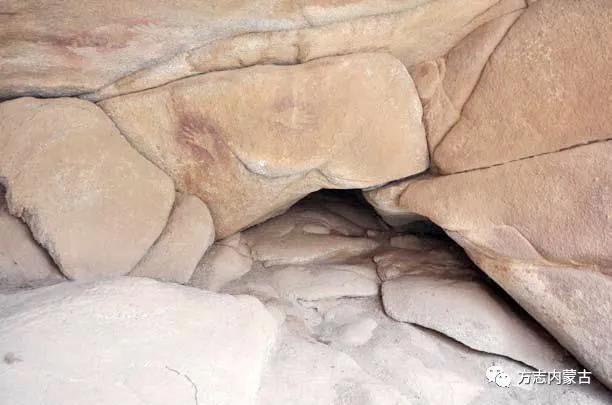 布布洞穴手印巖畫位于阿拉善盟阿拉善右旗雅布賴蘇木北30公里,在雅布賴山,沙棗溝北脈布布石頭洞,地理位置北緯103°3′6″,東經(jīng)39°43′2″,平均海拔高1705米。布布是幾峰之間的泉水名稱。巖畫繪于距泉西50米處的一座花崗巖石洞里,是用土紅色的顏料繪出多個手印,其中有1個右手印、9個左手印,手印最大長22厘米、寬10.5厘米,最小長11厘米、寬8.7厘米。根據(jù)布布手印巖畫和有關(guān)資料來看,此巖畫制作時間較早,周圍沒找到其他可佐證的遺址及遺物,經(jīng)研究,其繪制方法為噴繪,一手按于石壁,以礦物顏料噴于手處,再逐漸抬手,即形成手印巖畫。此類作品繪于洞穴中,屬于舊石器時代晚期的作品。