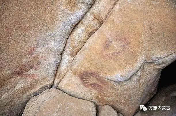 據(jù)考察,繪在陶乃高勒洞窟東側(cè)立壁上的兩個(gè)手印尤為醒目,色彩渾厚,紫中泛藍(lán),畫(huà)面古樸自然,手印清晰。