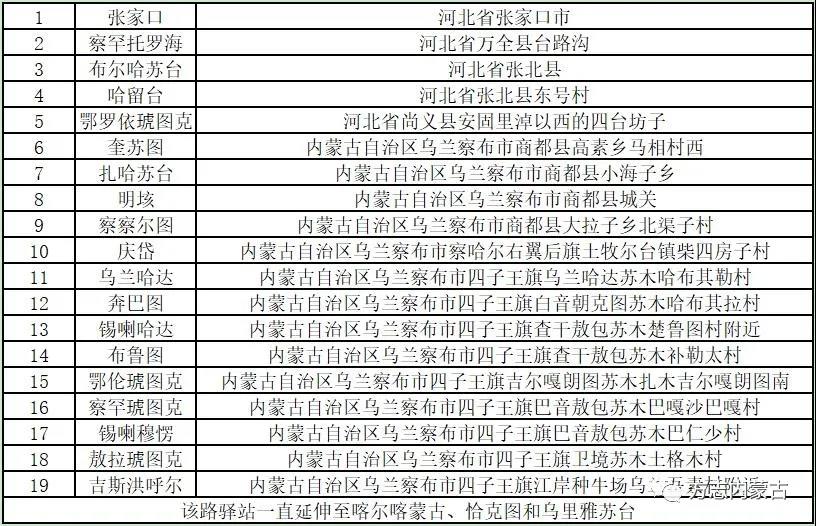 張家口驛路,由于清雍正二年(1724),阿爾泰軍臺(北京—科布多軍臺)由殺虎口改移張家口北出后,雍正六年(1728),清廷下令裁撤從張家口到歸化城一路,并將原張家口至四子部落旗一路與改移阿爾泰軍臺的南段(張家口至賽爾烏素段)并為一路。改建后的張家口驛路之驛站,除張家口漢站外,安設察罕托羅海、布爾哈蘇合、哈留臺、鄂羅依琥圖克、奎蘇圖、扎哈蘇臺、明垓、察察爾圖、慶岱、烏蘭哈達、奔巴圖、錫喇哈達、布魯圖、鄂倫琥圖克、察罕琥圖克、錫喇穆楞、敖拉琥圖克、吉斯洪呼爾等蒙古軍臺18處。