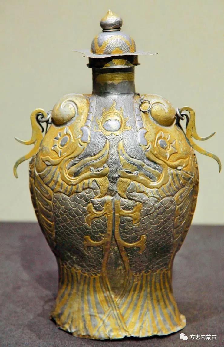 壺身為橢圓形,壺口直高,壺身通體鏨刻摩羯魚兩尾,呈直立兩兩相抱狀。魚龍頭上唇翻卷,吐舌長伸,兩口之間鏨刻一火焰紋寶珠,意為二龍戲珠。魚流線形軀體和壺身形狀相吻合,肩部以鰭卷起尖結(jié),鱗和尾鰭鏨刻細致入微,造型生動逼真。