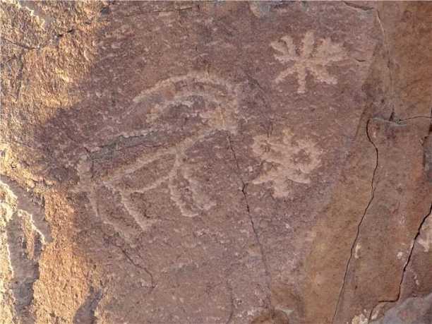 鄂托克旗伊克布拉巖畫位于阿爾巴斯蘇木伊克布拉供銷社東南約7公里。巖畫鑿磨在山谷陡峭的黑色火成巖石壁上,石面平整光滑。畫面是由人形和羊、狗、駱駝等動(dòng)物組成的,面積方形,每邊長(zhǎng)4米。駱駝的頭部高高昂起,傲視遠(yuǎn)方,背上雙峰高聳,短而小的尾巴下垂。而山羊和狗都呈奔跑狀。巖畫中的人形則為一男性特征明顯的形象,表現(xiàn)了遠(yuǎn)古居民對(duì)生殖崇拜的心理。