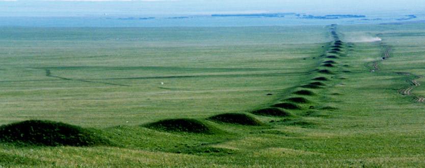 沿線地形考察結(jié)果表明,在赤峰北部近560公里的邊堡界壕。筑在較平坦的草地上的約占40%,筑在山谷間或平緩的丘凌地上的約占60%。從地貌看,大多地段已被風(fēng)沙湮沒,地面草木稀疏,植被欠佳,平均植被覆蓋率約為15%~20%左右。界壕沿線地地貌的特點(diǎn)是;北側(cè)或西北側(cè)(界壕以外)一般都有山峰、較高的丘陵山岡作自然屏蟑,內(nèi)側(cè)(界壕以內(nèi))地勢一般較平,有的為低矮的丘陵。但仍有部分為較開闊的草原或山谷草甸草地,附近多有河流,水溪,既宜于畜牧,也利于戍守。