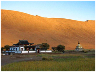 巴丹吉林沙漠是世界最大的鳴沙區(qū)。其中鳴沙山被譽(yù)為“世界鳴沙王國”,其鳴沙面積大,無污染,響聲奇特,從高處滑下轟隆隆有如雷鳴。