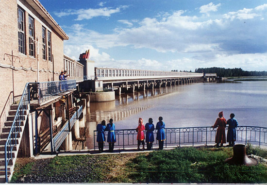 赤峰市翁牛特旗海日蘇水利樞紐位于西拉木倫河中下游,工程19763月由翁牛特旗施工興建。19788月竣工。先后有25個(gè)公社(場),6000名農(nóng)牧民參加施工。主體工程由24孔攔河閘、左右岸3孔進(jìn)水閘、1013米土壩,600千瓦水電站及公路橋組成,設(shè)計(jì)標(biāo)準(zhǔn)為百年一遇,洪水平面120/秒,是一座以灌溉為主,兼有交通、發(fā)電、治沙等社會效益的水利樞紐工程,也是全區(qū)最大的牧區(qū)樞紐工程。