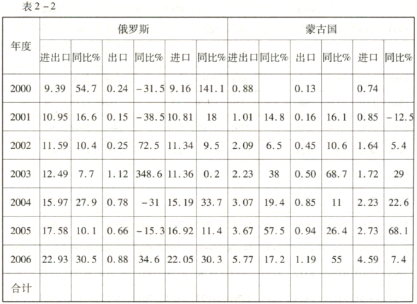 2000—2006年自治區(qū)對俄、蒙貿(mào)易情況
