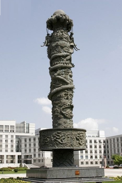 呼和浩特市新城區(qū)政府廣場雕塑為鑄銅九龍柱,高18米,重約23噸,總造價200萬元,青銅鑄造而成,是由內(nèi)蒙古外貿(mào)工藝品廠國家級工藝美術(shù)大師潘德月先生設(shè)計,由北京鑄造廠建造的,是全國最高的鑄銅九龍柱。該柱中間最粗部分直徑4.68米,上面雕著七條盤龍,它象征著新城區(qū)的7個街道辦事處,中上部直徑2米,最粗部分2.68米,上面雕著兩條盤龍,它象征著新城區(qū)的一鄉(xiāng)一鎮(zhèn)。最上端托著一個金球,上面雕著新城區(qū)的區(qū)域圖,它象征著新城區(qū)。龍是中華民族力量的象征,也是中華民族奮發(fā)開拓、自強(qiáng)不息精神的代表。新城區(qū)建造九龍柱寓意是一鄉(xiāng)一鎮(zhèn)、7個街道辦事處在區(qū)委、區(qū)政府的領(lǐng)導(dǎo)下團(tuán)結(jié)拼搏、奮發(fā)圖強(qiáng)、開拓創(chuàng)新、事業(yè)騰飛。“九龍柱”的建造為新城區(qū)乃至呼和浩特市又樹立起一個標(biāo)志性的雕塑。