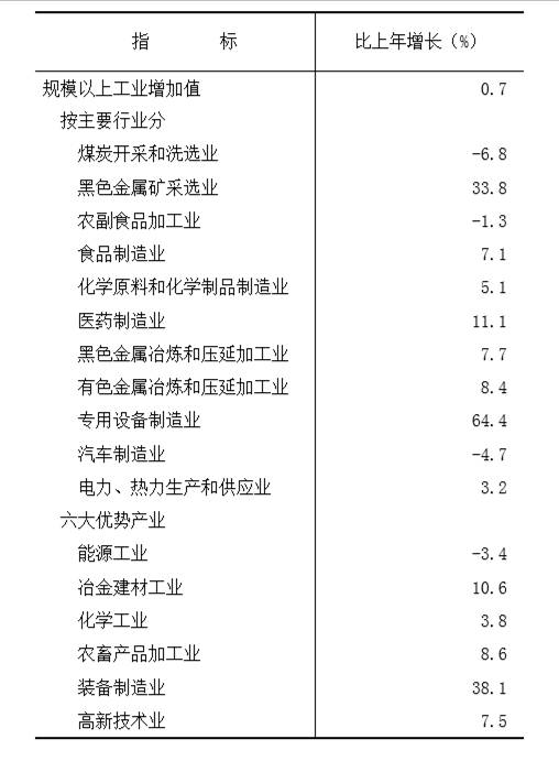 全年全部工業(yè)增加值比2019年增長0.8%。其中,規(guī)模以上工業(yè)增加值增長0.7%。在規(guī)模以上工業(yè)中,分經(jīng)濟類型看,國有控股企業(yè)增加值增長3.5%,集體企業(yè)下降56.6%,股份制企業(yè)增長1.3%,外商及港澳臺商投資企業(yè)下降3.6%。分門類看,采礦業(yè)下降7.1%,制造業(yè)增長8.4%,電力、熱力、燃氣及水生產(chǎn)和供應(yīng)業(yè)增長3.7%。分行業(yè)看,食品制造業(yè)增加值增長7.1%,化學(xué)原料和化學(xué)制品制造業(yè)增長5.1%,黑色金屬冶煉和壓延加工業(yè)增長7.7%,通用設(shè)備制造業(yè)增長3.3%,專用設(shè)備制造業(yè)增長64.4%,汽車制造業(yè)下降4.7%,電氣機械和器材制造業(yè)增長196.9%,計算機、通信和其他電子設(shè)備制造業(yè)增長50.1%,電力、熱力生產(chǎn)和供應(yīng)業(yè)增長3.2%。