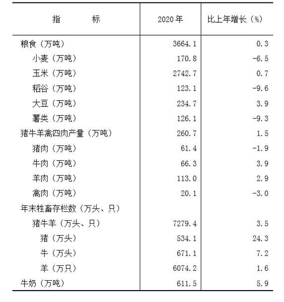 表2 2020年主要農(nóng)畜產(chǎn)品產(chǎn)量和牲畜存欄數(shù)及其增長速度