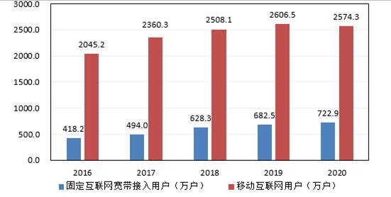 圖6 2016—2020年固定互聯(lián)網(wǎng)寬帶接入用戶數(shù)和移動互聯(lián)網(wǎng)用戶數(shù)