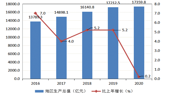 地區(qū)經濟實力進一步躍升。“十三五”時期,中國經濟由高速增長階段轉入中高速增長階段,全區(qū)積極應對各種風險和挑戰(zhàn),經濟平穩(wěn)運行。全區(qū)地區(qū)生產總值從20151.29萬億元增加到2020年的1.74萬億元,按可比價格計算,“十三五”時期年均增長4.3%