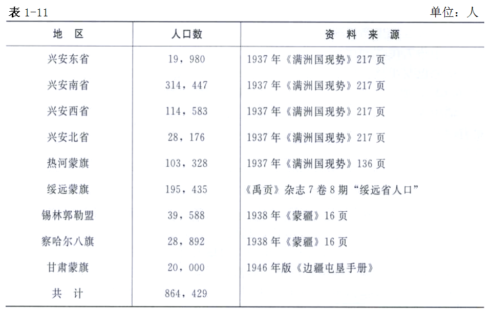 清末宣統(tǒng)年間對(duì)全國有一次較詳細(xì)的戶口調(diào)查,這時(shí)對(duì)蒙古族人口也有明確統(tǒng)計(jì),據(jù)查民國22年(1933年)《中國經(jīng)濟(jì)》年鑒修正民國元年內(nèi)務(wù)部匯造統(tǒng)計(jì)表的記載:內(nèi)蒙古蒙古族總?cè)丝谶_(dá)到877 946人,去掉已劃歸東北三省的蒙古族人口,按現(xiàn)在內(nèi)蒙古行政區(qū)劃范圍,實(shí)有828 977人。