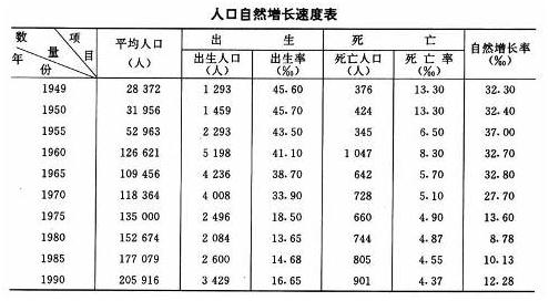 1949~1963年,平均出生率為43.86‰,14年凈增74 953人,增長(zhǎng)2.5倍,平均年遞增10.11%。1964~1990年,平均出生率為12.77,27年凈增88 511人。